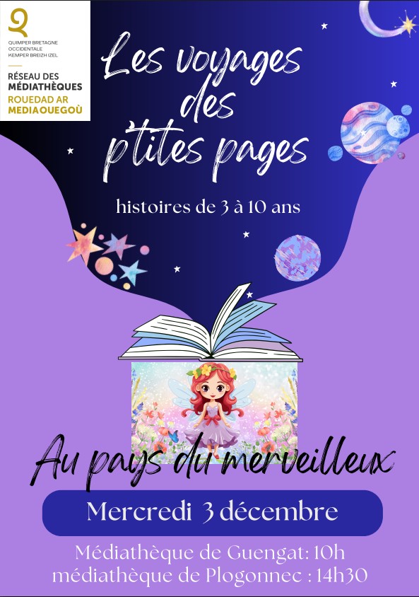 La médiathèque organise le mercredi 3 décembre à la médiathèque de GUENGAT à 10h des histoires pour les enfants de 3 à 10 ans "Les voyages des petites pages, Au pays du merveilleux". Les histoires de Catherine et Sonia vont vous faire voyager au pays du merveilleux : magie et mystère seront au rendez-vous. Dès 3 ans.